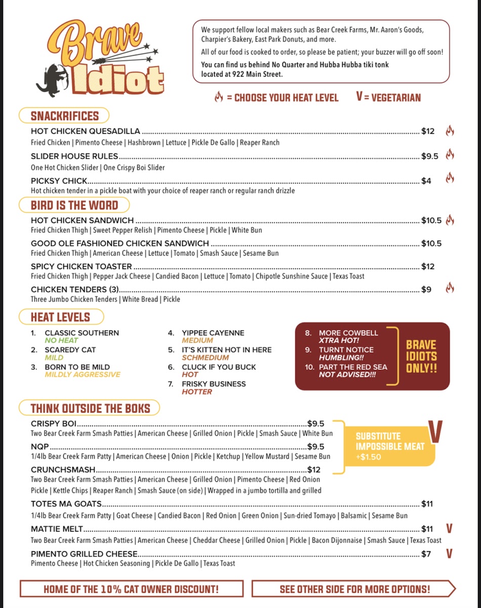 With heat levels that challenge even the bravest, diners can savor both the spice and the juicy chicken. Customers rave about the tender, perfectly cooked meat that remains juicy and flavorful. Whether you're a local or just passing through, make Brave Idiot a priority on your gastronomic adventures!