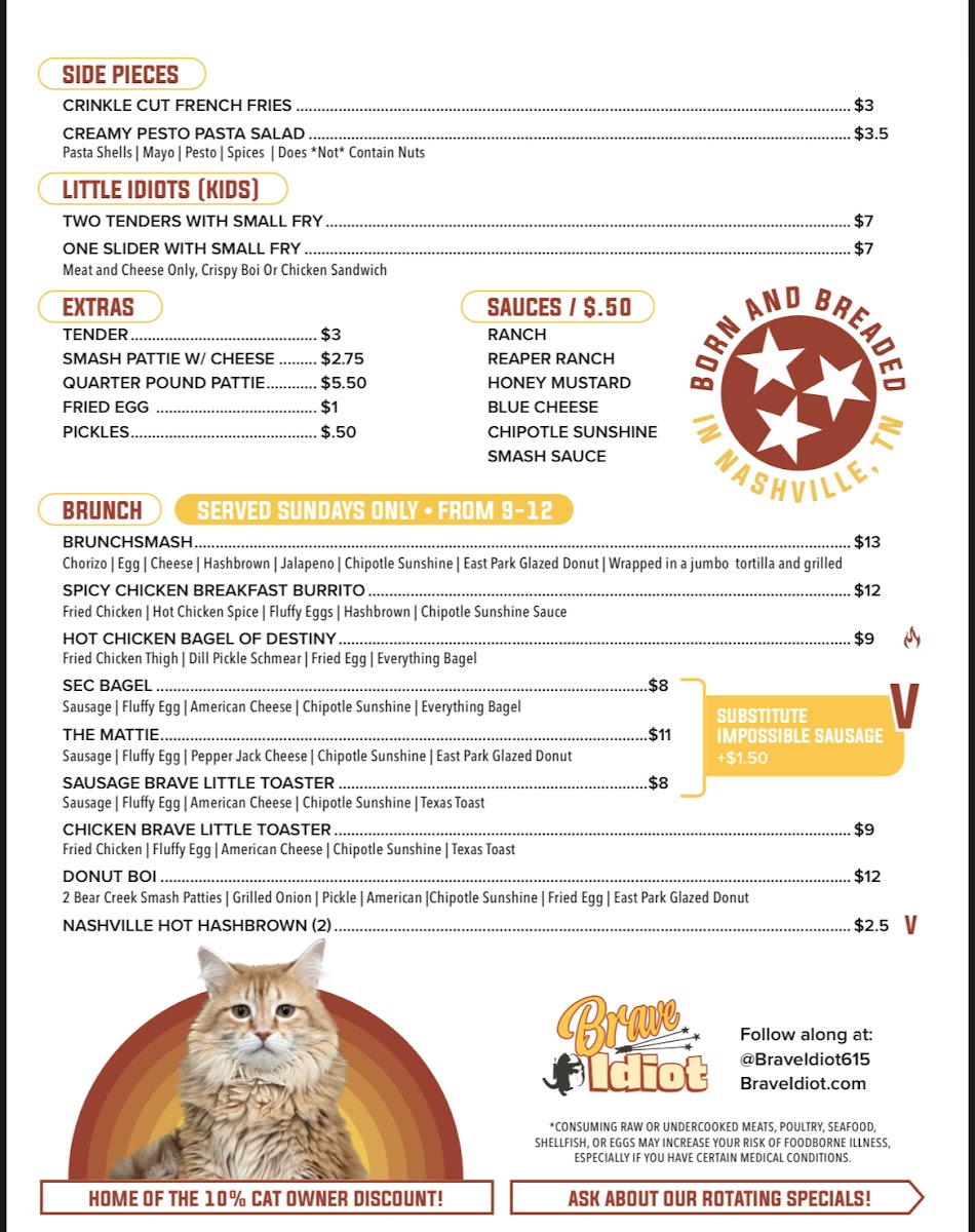 Welcome to Brave Idiot, a culinary gem nestled behind No Quarter on Main Street in Nashville. Known for its authentic Nashville-style hot chicken, this food truck offers a menu brimming with bold flavors and playful twists. Expect mouthwatering creations like the Hot Chicken Sandwich and Spicy Chicken Toaster, both harmonizing crispy chicken with delicious toppings like pimento cheese and pickles.